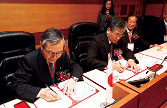 陳繁興校長(左2)與馬場校長(左1)在「協定書」上簽名,兩校將正式展開交流。