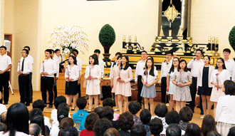 國高中生、青年部代表手持康乃馨高唱〈母親〉,表達對創價婦人部的無限感謝。