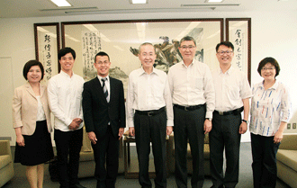 林釗理事長熱烈歡迎《聖教新聞》記者村上進(左3 )、井崎伸明( 左2)