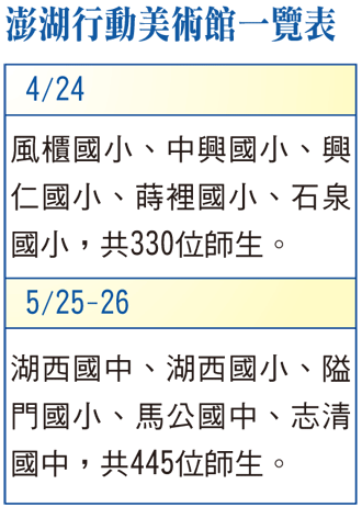 5月25、26日,創價前往湖西國中、湖西國小、隘門國小、馬公國中、志清國中等校進行「行動美術館」活動,共有445位師生參與。