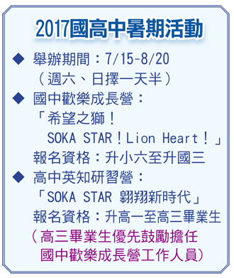台灣創價學會 版權所有 轉載必究 © 2014 Taiwan Soka Association All Rights Reserved. 111台北市士林區至善路二段250號 TEL:(02)2888-1777