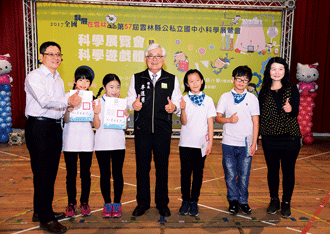 雲林一區林內地區未來部張采甯(左3)參加「雲林縣第57屆中小學科展」比賽,在眾多參賽展品中脫穎而出,3月31日獲得國小組化學組縣賽第一名的殊榮,縣長李進勇(左4)親自頒獎加以表揚。