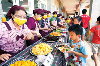 婦人部餐點組為了「用美食抓住大家的胃」,花了一個多月的時間討論菜單,每一餐都準備色香味俱全的豐盛餐點,宵夜更準備東石最新鮮的蚵仔麵線,雖然在廚房忙得汗水淋漓,而看到景山學童吃得開心又滿足,就讓大家覺得一切辛苦都值得了!