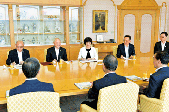 梁聖時董事長(左2)、尚世昌校長(左1)一行人受到創大田代康則理事長熱烈歡迎。