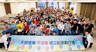 為能培育愛好音樂、吹奏和平樂音的未來部、國中部後繼人才,創價於今年成立「天鼓管樂希望團」,7月8日在新莊文化會館舉辦「成立紀念勤行會」,首屆團員、家長、團隊大姐姐近百人齊聚一堂歡喜慶賀,婦人部長杜季貞蒞臨鼓勵。
