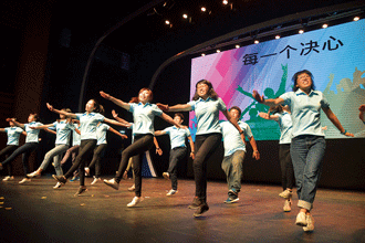 創價青年在晚會中進行〈太陽升起〉帶動。(7.24)