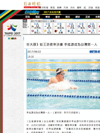 《自由時報》等媒體報導創價青年李炫諺蛙式,進入準決賽。