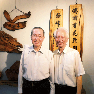 永和區壯年部林源興(右)8月5日至31日期間舉辦「字在自在」版刻創作展,許多親朋好友、會員前往觀展,林理事長17日專程蒞臨祝賀。