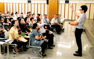 20日安南會館場次, 講師趙豫麟透過圖文講解及推廣影片,讓與會者了解安CPR與AED的使用方法與時機。他提醒大家,牢記「CPR-用力壓、快快壓、胸回彈、莫中斷」、「叫叫CD」等口訣,再搭配現場實做訓練,更能加強記憶力。婦人部黃淑娟說:「今天的急救課程除了講解之外,還包括實際操作,我本身是醫護人員,深感急救常識人人都需具備,是很棒的課程!」