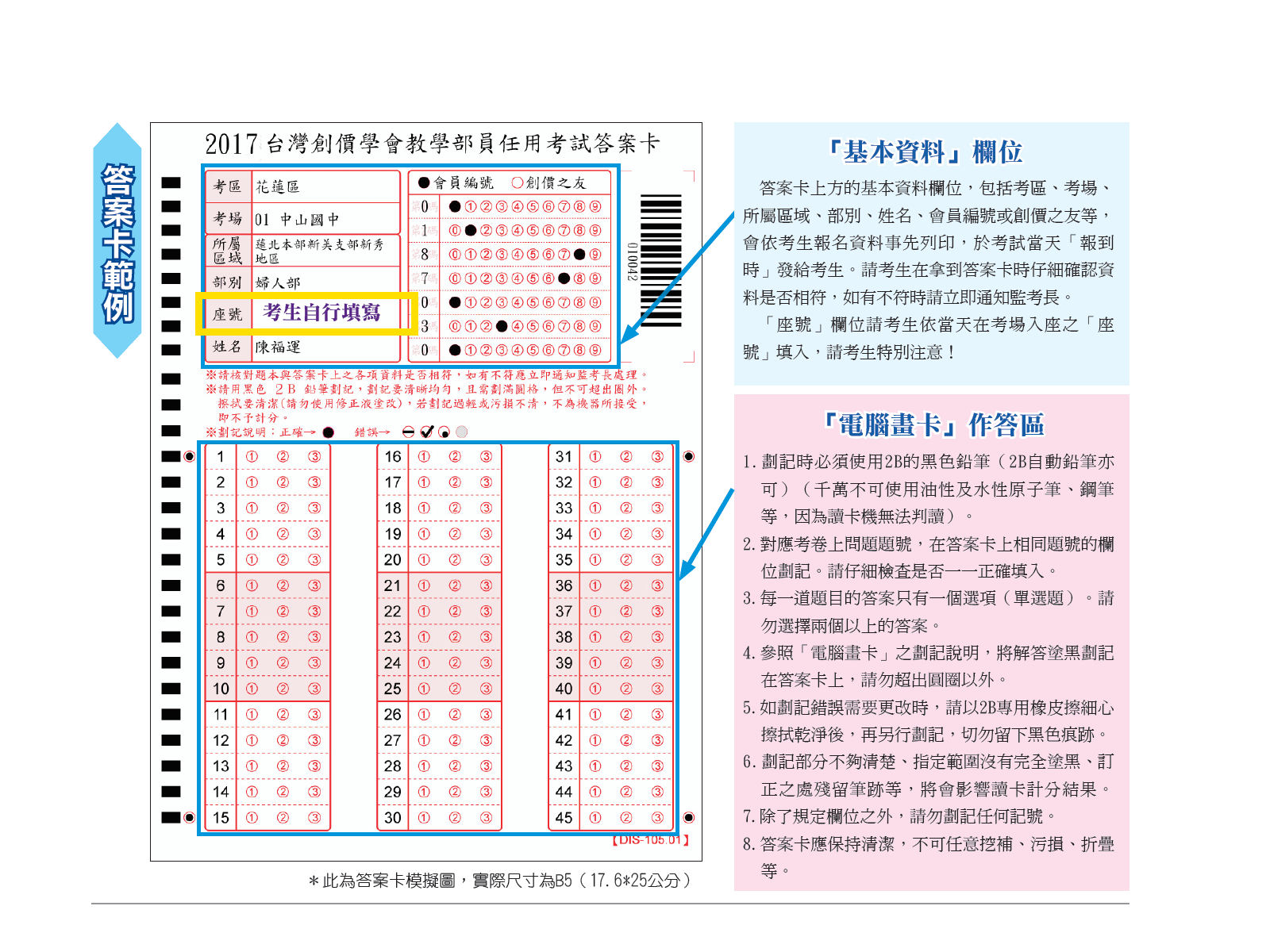 教學部員任用及進修考試將於11月5日舉行,兩項考試皆將以電腦閱卷的答案卡劃記方式作答,為使考生更了解作答方式,本報特刊載相關的作答說明。