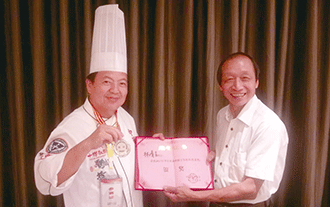 桃園東區壯年部林清全(左),9月17日參加大陸湖南省舉辦的「中華食祖炎帝廚王爭霸賽」,榮獲銀獎殊榮。