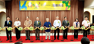 「書藝風采 文化尋根 創價藝文典藏系列展」開幕典禮,10月15日在桃園藝文中心隆重舉行,創作者陳宏勉(左3)、張炳煌(左4)、戴武光(左5)、薛平南(右4)、林進忠(右3)等多位書藝家蒞臨剪綵,貴賓雲集、場面熱烈。