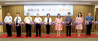 10月15日,高雄鹽埕藝文中心「鶴舞玄風 陳丁奇書藝精品展」,在鋼琴與小提琴的悠揚樂聲中揭開序幕。當天,陳丁奇的孫女陳怡靜(上圖右4)代表主持,高雄市副市長許銘春(左5)、台南大學教授黃宗義(左4)、右昌國中校長方靜慧(右2)等貴賓蒞臨祝賀,場面熱烈。