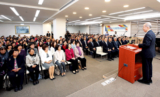 林理事長對於長年來提供龍峯講堂的楊飛龍與林國峯兩人的真心奉獻,特別致上感謝之意,並提到,為指導文化團隊竭盡心力的磯貝老師,特別在落成啟用前撥冗前來視察,對於空間設計及隔音設備等方面給予許多寶貴意見。磯貝老師對於台灣S G I為培育文化廣布人才,提供優質硬體設備的用心,給予高度肯定。