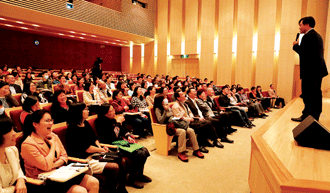 當天,劉教授透過豐富的肢體動作、嘹亮歌聲、平易近人的生活實例,並教導大家實際演練腹式呼吸法,讓與會者學習到如何在劇烈變化的社會中,持續磨練自我、發揮領導力,讓人獲益良深、全場掌聲、笑聲不斷。