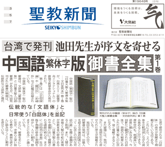 《聖教新聞》於1月19日在頭版頭條以「台灣發行《日蓮大聖人御書全集 文白並列本I 》池田先生贈予序文」為標題,大幅刊載台灣SGI發行繁體中文版《日蓮大聖人御書全集》第一冊的好消息。