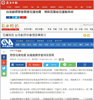 創價投入花蓮強震救災及捐款的行動,獲得中視新聞、三立新聞、東森新聞、中天新聞等電視媒體,及中央社、自由時報、蘋果日報、更生日報、經濟日報等10多家網路媒體大幅報導。