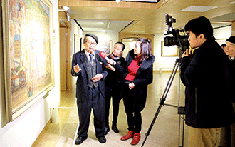 好事聯播網主持人翁碧蓮(右2)透過專訪向民眾推廣詹浮雲創作展。(1.30)