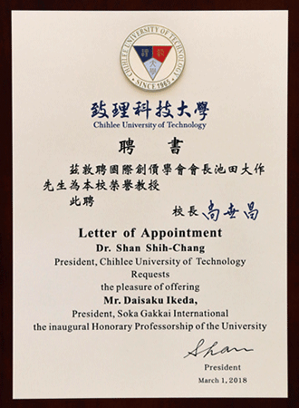 國內技職體系一流學府的「致理科技大學」頒贈該校第一號「榮譽教授」稱號給日本創價大學創辦人池田SGI會長,以讚揚池田先生畢生致力推動文化、教育活動,促進世界和平、實現人類幸福的偉大貢獻。