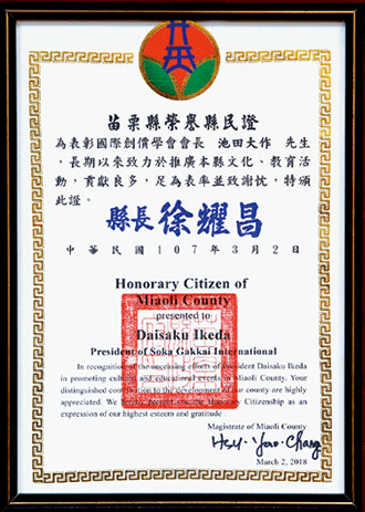 苗栗縣政府頒發「榮譽縣民證」給池田SGI會長,這是該縣為讚揚池田先生長年來帶領台灣創價學會作為好縣民,致力推動文化、教育、和平活動,所付出的努力與貢獻。