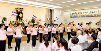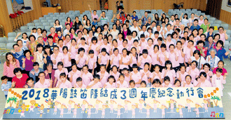 4月29日,華陽鼓笛隊在台中金弘笙講堂舉辦「三週年紀念勤行會」,300多位隊員、家長及台中圈會員齊聚一堂高喊「生日快樂」。