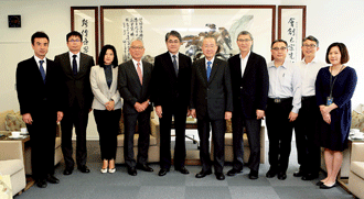 承建花蓮文化會館的「中鹿營造股份有限公司」董事長小野寺俊博(左5)、執行副總經理依藤進(左4)等一行人,5月9日蒞臨至善文化會館拜會,受到林釗理事長熱誠接待。