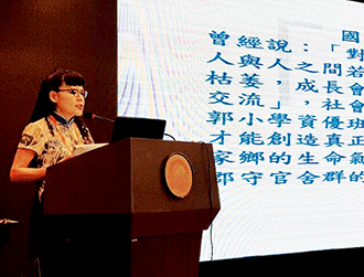 教師部馮幼中校長介紹她秉持創價教育理念,推動校務、培育學生的成果。