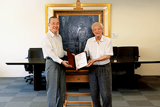 陳景容教授(右)蒞臨至善文化會館致贈畫作〈羅馬廣場與裸女〉,高度肯定創價推廣藝文活動的努力