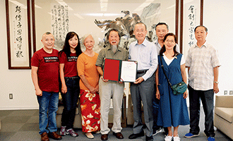 高齡91歲的李再鈐教授(左4)在家人陪同下,蒞臨至善文化會館致贈其〈低限的無限〉雕塑作品,高度肯定創價推廣藝文活動的努力。