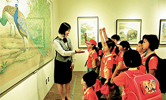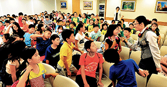 桃園市石門國小學生前來桃園藝文中心參觀,與導覽員熱烈互動。 6.27