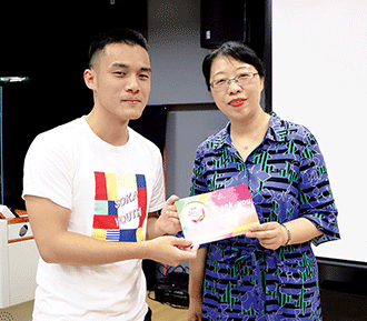 創價青年致贈卡片給大連工業大學劉愛君教授(右)(7.4)