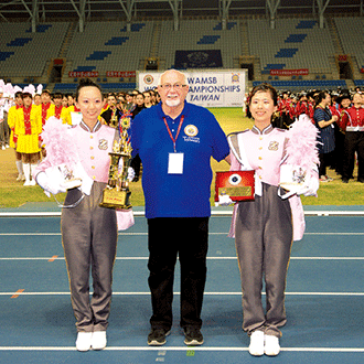 加拿大評審麥克˙湯森(中)代表頒發銀牌獎給台北天使鼓笛隊