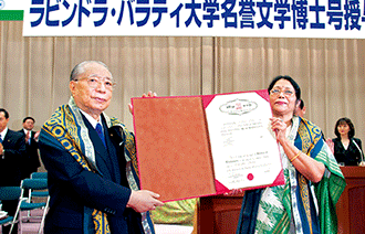 2004年,慕克吉博士(右)前往東京,頒授該校榮譽文學博士給池田先生。