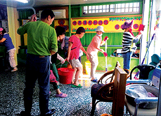 2 5 日, 趁著雨勢減弱,嘉義區祥和支部長涂文周帶領當地幹部,前往災情慘重的會友家裡,協助清理環境,展現人溺己溺的救助精神。