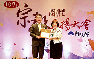 內政部長徐國勇頒發「宗教公益獎」給創價,副理事長杜季貞代表接受。