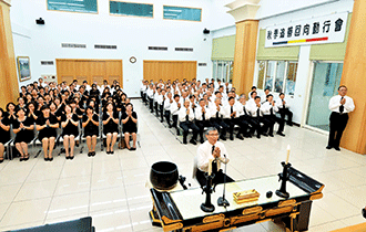 對於「慈恩堂」工作人員長年來服務會員的無私付出,林執行長代表林釗理事長致上最誠摯的謝意與敬意,並轉達鼓勵口信,說:「最高的追善回向,就是自己本身確信御本尊、唱奉題目,每天為廣宣流布所展開的尊貴行動」,並以《御書》所云:「此功德更將及於父母、祖父母,乃至無邊眾生。」期勉每個人都能自覺使命、胸懷嶄新的廣布誓願,邁步於廣布大道──這就是對故人的最高回向。
