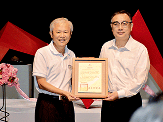 台東縣陳金虎副縣長(左)代表縣府頒贈感謝狀給池田SGI會長,洪玉柱副理事長代表接受。