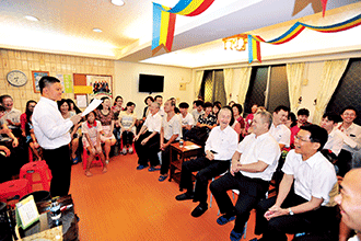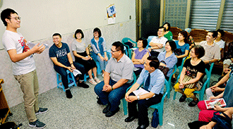 18日頂埔組(城林區)座談會,許多爸爸媽媽、爺爺奶奶帶著子女、孫子女一起出席。未來部劉宣傑擔任「事務傳達」,他滿臉笑容地拿著大字報,適時地調整角度,讓坐在各個角落的人都能看得清楚,落落大方的表現,讓人讚賞。