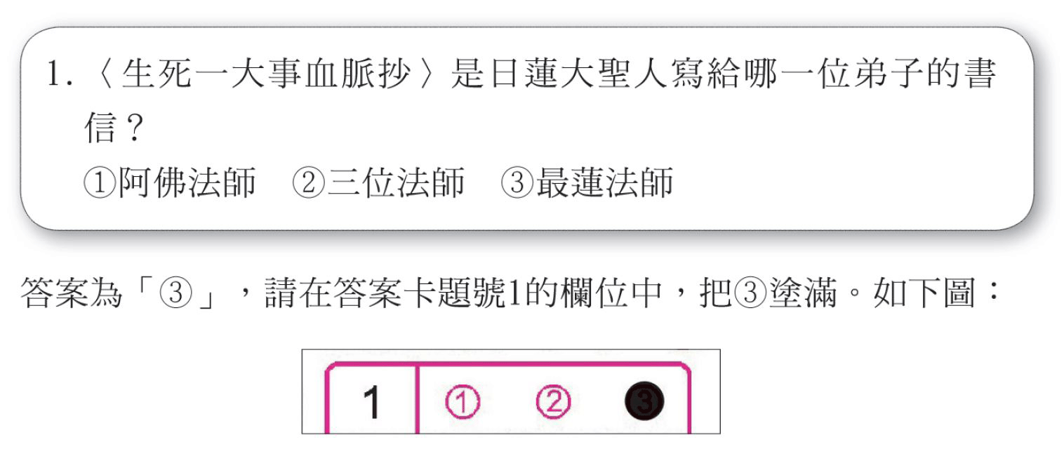 1.題目試卷一份,會有45道題目,每一題都會列出3個選項,每一道題目都是「單選題」(正確答案只有一個),請勿選擇兩個以上的答案。