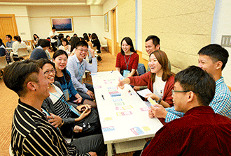 在「大對話運動」單元,研究生們運用「幸福點線面」學習單,分享挑戰困難的經驗,透過彼此真心鼓勵,激發自身戰勝煩惱的潛能。