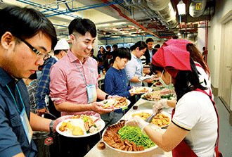 彰投圈「愛心後援會」,為了讓研究生能歡喜地享用午餐,活動當天,天還沒亮就開始購買食材,用愛心烹調、色香味俱全的佳餚,期讓每位同學不斷地發出「好好吃」、「好幸福」的讚嘆聲。