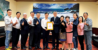 劉增應縣長(左6)頒發「榮譽縣民證書」給池田先生,林廷鋒執行長代表接受,縣府民政處王建華處長(右1)及基宜圈、馬祖會員到場觀禮。