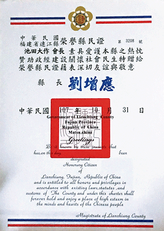 連江縣政府頒發「榮譽縣民證書」給池田SGI會長 |