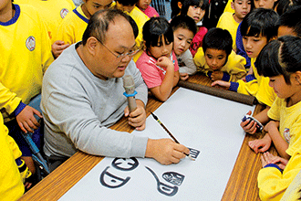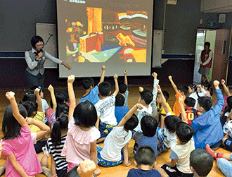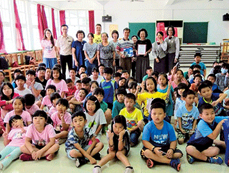 雲林縣中溪國小行動美術館,學生踴躍參與有獎徵答,創作者黃伯驥醫師(右5)贈送親筆簽名畫冊。(6.28)