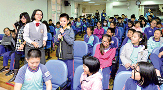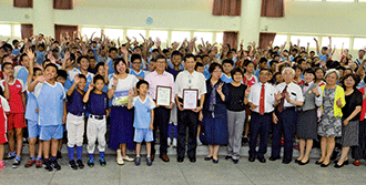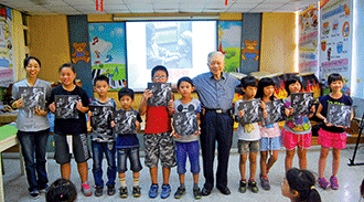 張克齊教授(前排持狀者左)於桃園市龜山國小,以當年喻仲林老師鼓勵自己的話「專精一藝,才能出人頭地」,勉勵學子要為喜歡的事物努力到底。(6.26)