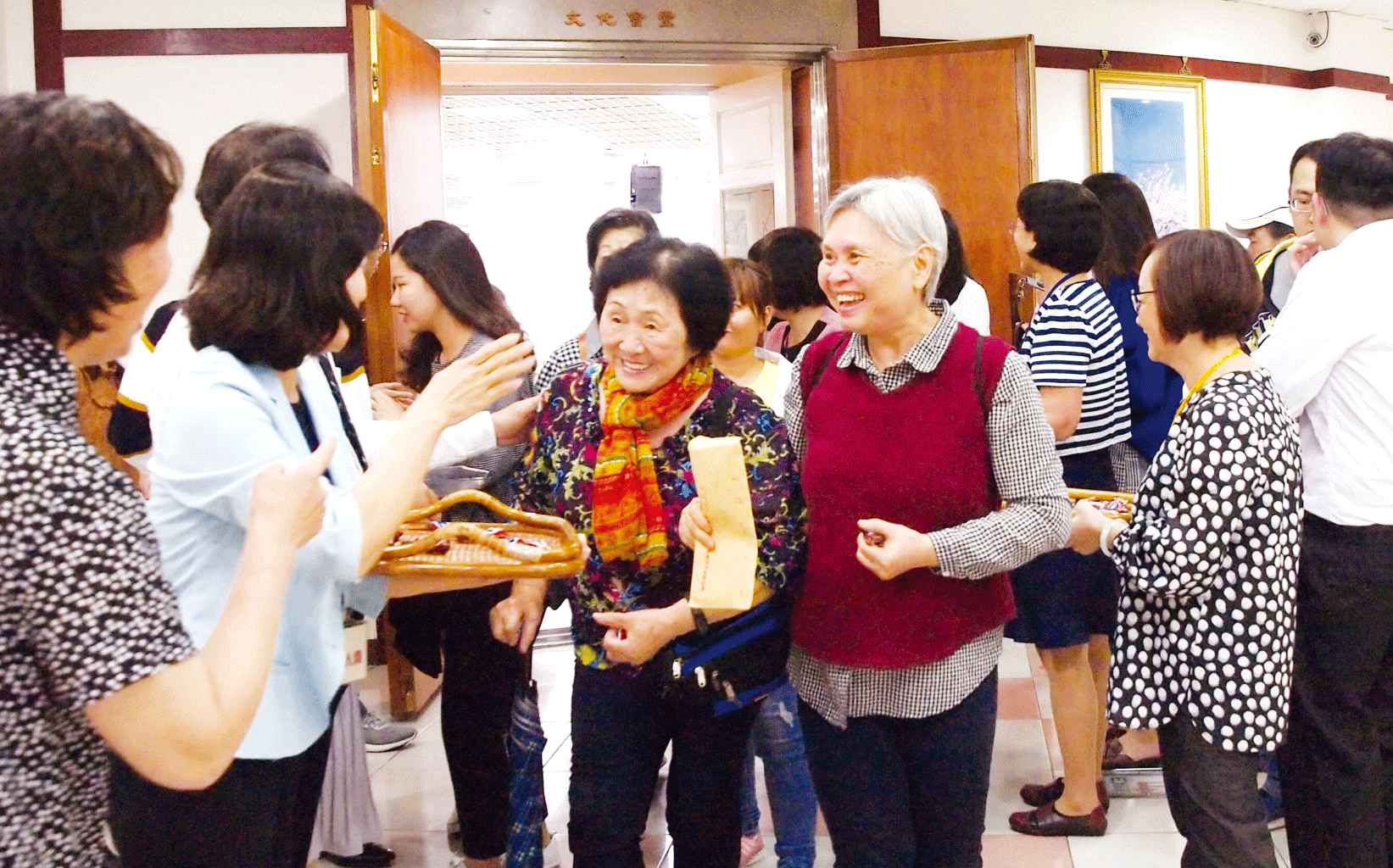 參加完總會的會員展露希望笑容,受到工作人員熱情歡送。(高雄南區文化地區/12.8)