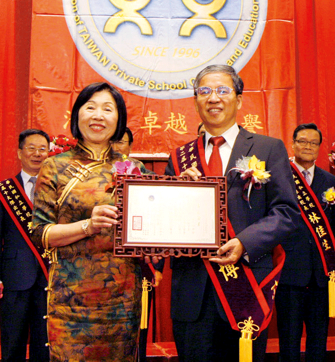 中華民國私立學校文教協會理事長胡宗鑫(左)頒贈唐彥博校長(右)獎狀