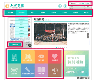 「創價新聞電子報」網頁版首頁主選單,有「報導.專欄」、「池田SGI會長」、「教學」、「信仰體驗」、「教育.心理」、「生活藝文」、「SGI NEWS」等類別。每個類別之下有數個選單,點擊相關單元即可閱讀該單元的文章。
