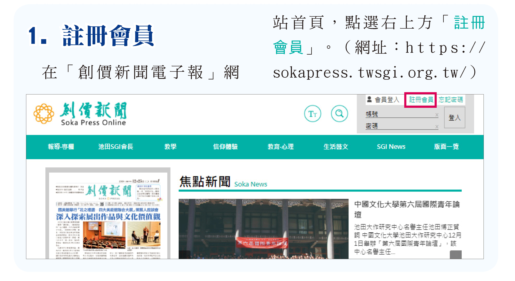 「創價新聞電子報」(Soka Press Online)於1月1日上線。註冊會員帳號後,不論是在家或外出等,只要在有網路的地方,就可以透過電腦、平板電腦、手機自由瀏覽、查詢《創價新聞》各個版面的內容。 本報繼12月28日介紹「創價新聞電子報」的主要功能之後,特別針對網頁版之「註冊會員及登入方式」進行介紹。 (電子報網站:https://sokapress.twsgi.org.tw/)