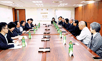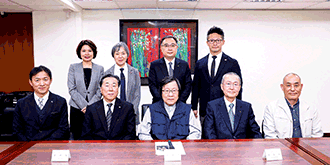 在林釗理事長(右4)陪同下,伊藤一人代表理事(右3)、飛鳥大五郎團長(右2)受到邱義仁會長(左4)熱烈歡迎。
